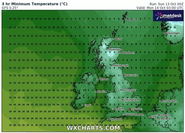 随着英国人准备迎接秋冬两季的凉爽气候,寒冷的天气不可避免地会到来,但根据WXCharts的数据,我们很快就会感受到刺骨的寒冷。天气预报早些时候发出的警告显示,本周末可能会出现第一场雪,之后似乎很快就会出现冰点。
