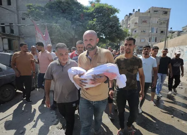 在以色列袭击努西拉特难民营后丧生的巴勒斯坦儿童的亲属将尸体送往医院(图片来源:Anadolu via Getty Images)