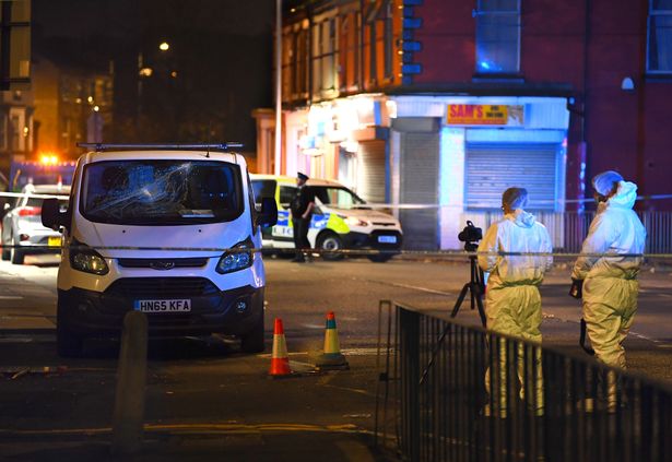 令人震惊的画面是,一辆面包车的挡风玻璃被砸碎,几辆警车和救护车聚集在一起开始调查。