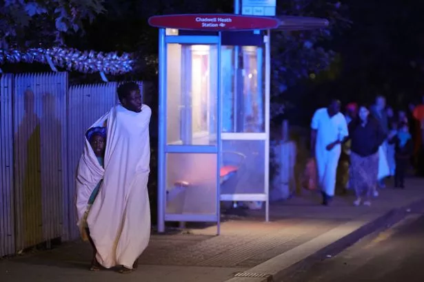 被疏散的居民步行到附近的一辆公共汽车上,消防员正在灭火(图片来源:George Cracknell Wright)