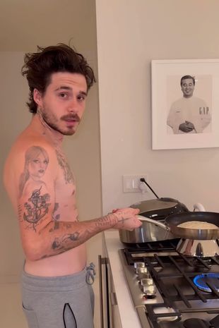 在为妻子尼古拉·佩尔茨做煎饼时,布鲁克林·贝克汉姆的脚被热油溅到,陷入了恐慌。