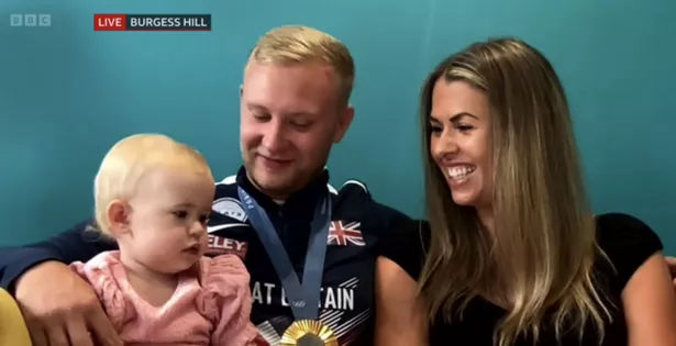当射击金牌得主内森·黑尔斯和他的两届奥运会冠军妻子夏洛特·克伍德在家中接受采访时,他们的小女儿海蒂突然从镜头前蹒跚而行。