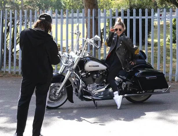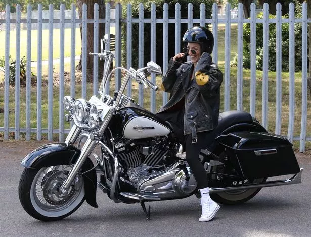 她在排练场地外试用了他的哈雷戴维森摩托车(图片来源:JAMES CURLEY和MAGICMOMENTSUK)
