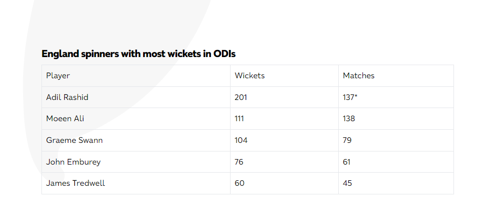 阿迪勒现在是英格兰在对外直接投资中领先的旋转手,加入莫恩·阿里(111)和格雷姆·斯万(104),成为唯一在男子对外直接投资中获得超过100个三柱球的旋转手。