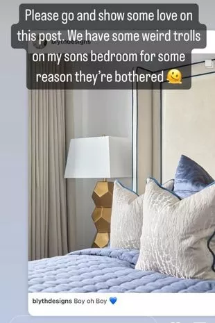 在自己的Instagram主页上,劳伦转发了一张奢华卧室的照片,一张巨大的床上精心摆放着毛绒天鹅绒枕头,旁边是一盏优雅的金灯,她给Blyth Designs贴上了标签,恳求道:“请在这张照片上表达一些爱。我儿子的卧室里有一些奇怪的喷子。出于某种原因,他们很烦恼。”
