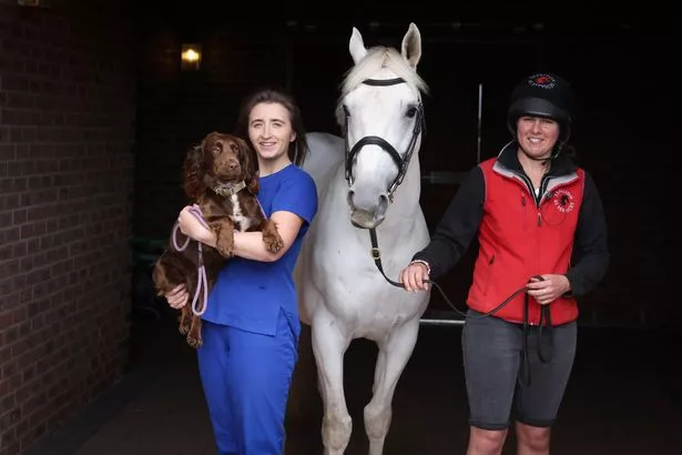 露西·摩根(左)和EJ·埃尔德里奇与克隆动物狗Gem和种马Murkas Gem(图片:镜子)