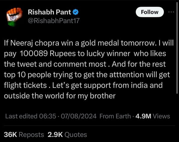 潘特在X上宣布了这一消息,他说:“如果尼拉杰·乔普拉明天赢得金牌,我将支付100,089卢比给最喜欢这条推文和评论的幸运赢家。剩下的,前10名想要获得关注的人将获得机票。让我们为我的兄弟争取印度和外部世界的支持。”