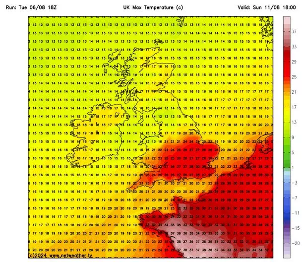WXCharts的预测显示,8月11日周日,英国部分地区气温将升至30摄氏度。东南部、西南部、东安格利亚、南威尔士和东米德兰兹都将感受到高温,在几天温和的天气之后,气温飙升——尽管北部地区会相当凉爽。