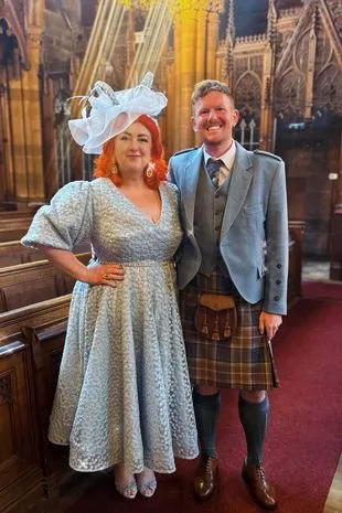 照片中的这位苏格兰明星穿着薄荷色的连衣裙,上面撒满了闪闪发光的水晶,在教堂的灯光下闪闪发光。米歇尔用一顶优雅的头饰来衬托这条裙子,头饰下可以看到她火红的头发。照片中紧紧抱着她的丈夫杰夫·尼莫(Jeff Nimmo)穿着苏格兰短裙,看起来也很整洁。这对夫妇于2017年结婚,育有两个孩子。