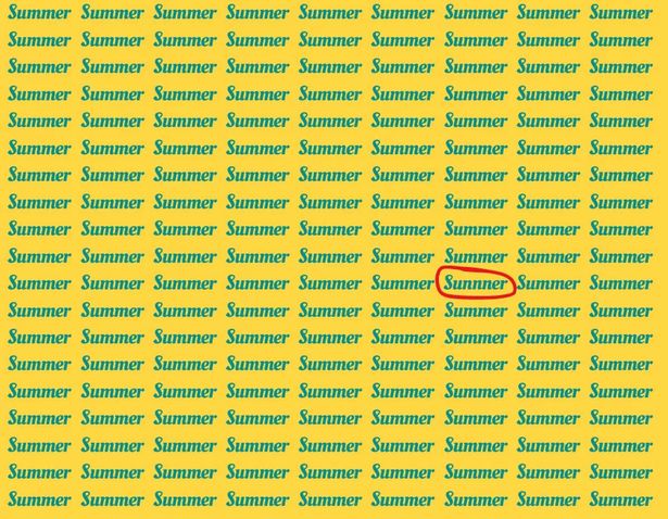 这个挑战的实质是在字母的海洋中找到拼写错误的单词。从图片上看,似乎大多数单词都是“summer”,但其中一个单词却被拼写成两个“n”,而不是“sunner”。教育网站Quizgecko表示,只有眼睛高度集中的观众才能在20秒内找到拼错的单词。这听起来很简单,但其实很难。这个词并没有被隐藏起来,而是显而易见的,但是由于同一个词的颜色和行,它会让你的大脑对你耍花招。
