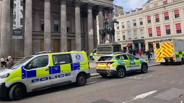 格拉斯哥现代艺术画廊在一名游客从阳台跳下后被迫提前关门,紧急服务人员赶到现场。