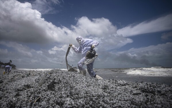 穿着全身防护服的清理人员手持筛子大步走进潮水,试图收集扁豆大小的塑料颗粒。