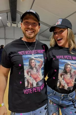 山姆和女友扎拉穿着“皮特威克斯”的主题服装出现,为他们的朋友加油(图片:没有信用)