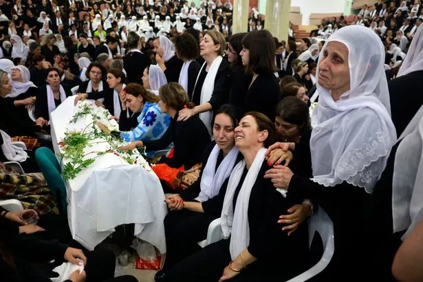 德鲁兹妇女在一名死者的葬礼上在棺材旁哀悼,死者一天前在黎巴嫩的火箭袭击中丧生(图片来源:法新社/盖蒂图片社)