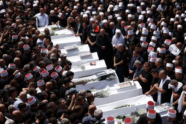 德鲁兹长老和哀悼者围着在火箭袭击中丧生的12人中10人的棺材(图片来源:法新社/盖蒂图片社)