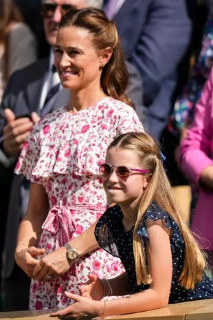 夏洛特坐在妈妈凯特和姨妈皮帕·米德尔顿中间观看(图片:盖蒂图片社)