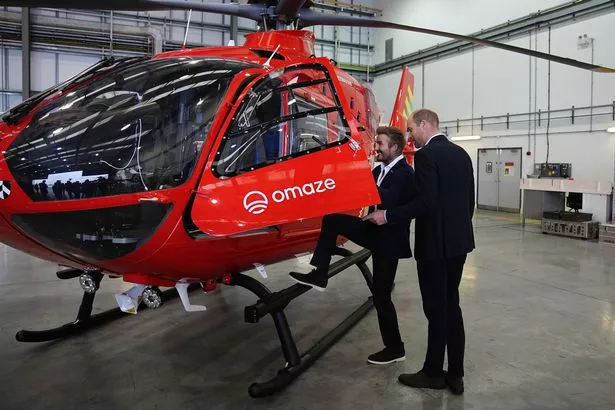 威廉王子和惊喜嘉宾大卫·贝克汉姆一起视察一架新的伦敦慈善空中救护直升机(Image: PA)