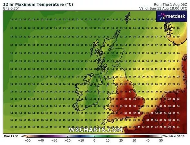 英国天气预报暗示,未来将是一个温暖的周末,WXCharts显示,8月11日,热空气可能从法国北部席卷而来,那里的气温预计将达到37摄氏度。