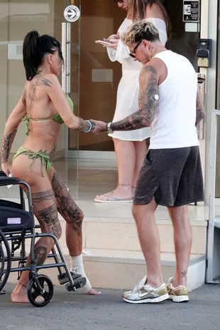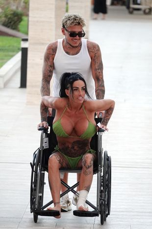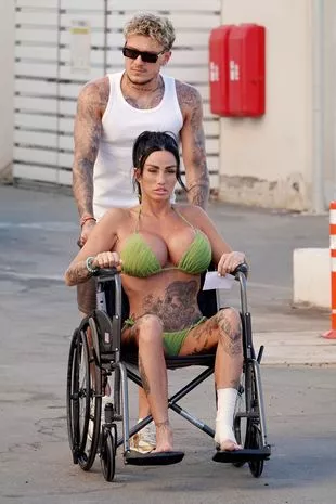身穿比基尼的凯蒂·普莱斯被拍到脚踝绑着绷带坐在轮椅上,男友JJ·斯莱特在度假时推着她四处走动。