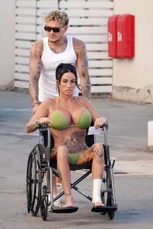 这位五个孩子的妈妈被拍到出现在医院停车场,她穿着绿色比基尼,坐在由她的伴侣推着的椅子上。在塞浦路斯,凯蒂看起来不太高兴,因为她的脚踝被绷带包裹着。