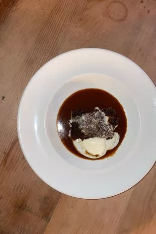 这对夫妇分享了黏糊糊的太妃糖布丁作为甜点,并享受了“甜美而轻盈的海绵蛋糕,浸泡在浓郁的黄油太妃糖酱中,充满焦糖味,但不会过度腻味,伴随着完美比例的香草冰淇淋,引入了奶油的对调。”