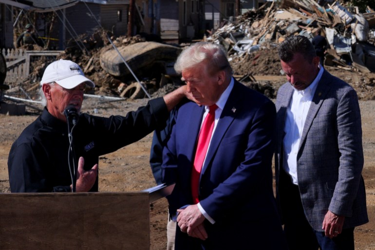 特朗普在他的车队沿途看到飓风在阿什维尔造成的破坏后说:“看到大自然的力量令人难以置信。”“你对此无能为力。但你得找一个更好的船员。”然后,他对风暴受害者表示同情。