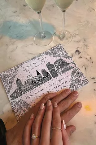 这对情侣在Instagram上分享了一张可爱的照片,他们的手,包括汉尼的戒指,放在曼彻斯特的创意黑白素描上,这座城市是他们浪漫的根源。这个迷人的“保存日期”显示了他们将于2025年7月26日在曼彻斯特结婚的日子。