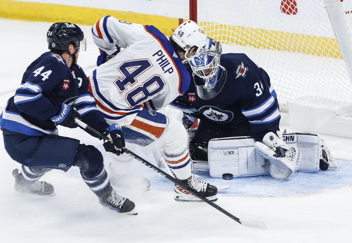 2024年9月25日星期三,在温尼伯举行的NHL季前赛第一阶段比赛中,34岁的温尼伯喷气机队守门员卡波·卡科宁(Kaapo Kahkonen)扑救了埃德蒙顿油人队48岁的诺亚·菲利普(Noah Philp)的射门,44岁的乔希·莫里西(Josh Morrissey)防守。加拿大新闻社/约翰·伍兹