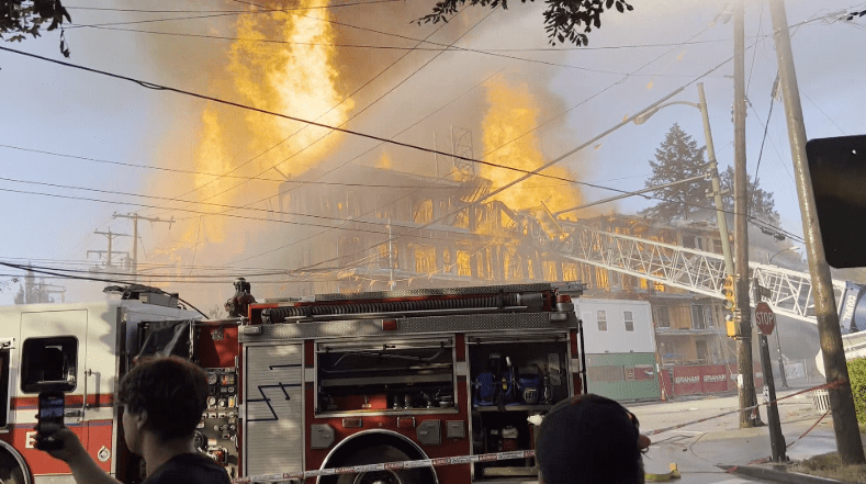 周二晚些时候,温哥华邓巴社区一栋六层楼的建筑发生火灾,并蔓延到附近的几栋房屋,烧毁了9栋房屋,并导致街对面的一台起重机倒塌。