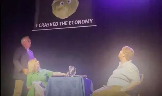 当这位前首相谈到唐纳德·特朗普时,“驴领”从天花板上揭开了一条秘密安装的横幅,上面画着一棵生菜,上面写着“我搞垮了经济”。