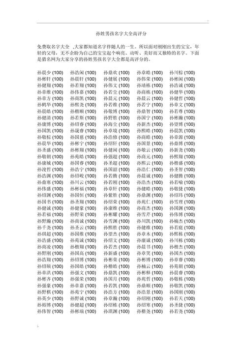 孙氏起名男孩是一项古老而重要的文化传统,在中国文化中被视为非常重要的事情。起名不仅仅是给孩子一个标识,更是寄托了父母对孩子的期望和祝福。以下是一些关于孙氏起名男孩的建议: