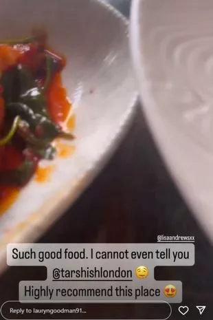 这位两个孩子的母亲,有一个四岁的儿子Kairo,还有一个叫“KW”的女儿和凯尔,她在照片下写道:“名人约会让我走出了自己的舒适区。”然后她在照片的底部补充说,她很享受在地中海餐厅他施的这道菜,尽管她没有透露她和谁一起吃饭的想法。Lauryn写道:“如此美味的食物。我甚至不能告诉你@tarshishlondon。强烈推荐这个地方。”