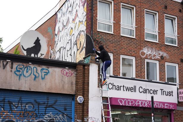 班克斯于8月8日星期四在佩克汉姆展出了他的嚎叫的狼作品(Image:PA)
