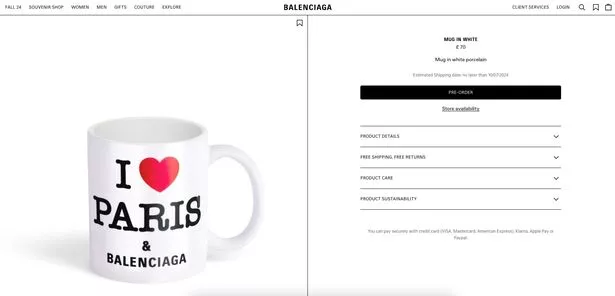 还有印有“我爱巴黎”的马克杯,售价70英镑(图片:果酱媒体/巴黎世家)