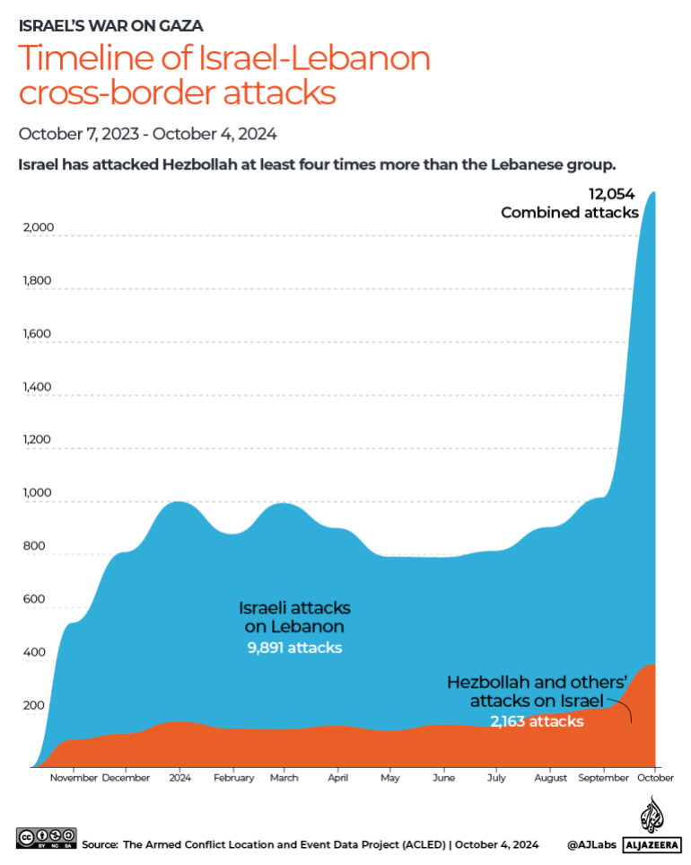 根据武装冲突地点和事件数据(ACLED),从2023年10月7日到2024年10月4日,以色列与黎巴嫩真主党和其他武装组织之间至少发生了12054起袭击事件。