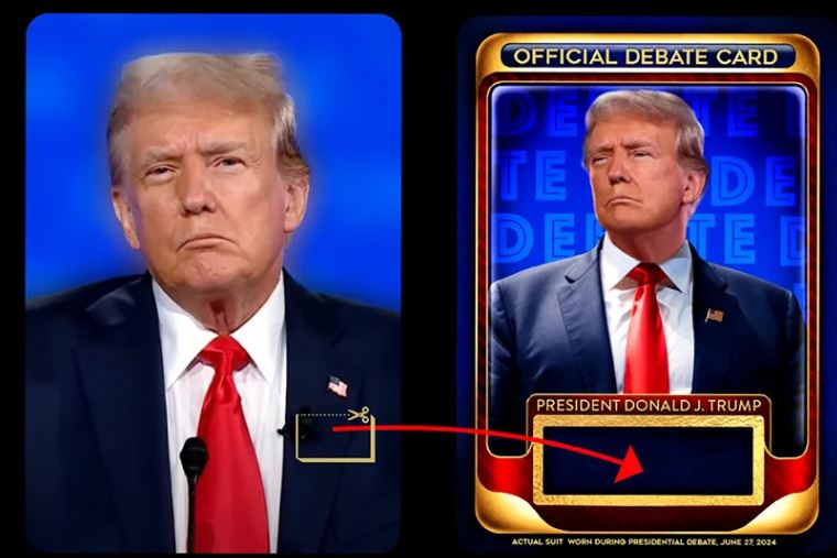唐纳德·特朗普(Donald Trump)又开始使用一英镑的电子交易卡了,但这一次,这位共和党总统候选人试图为一些潜在买家提供更甜蜜的交易,他在6月份与乔·拜登(Joe Biden)总统辩论时穿的西装的一件实物。