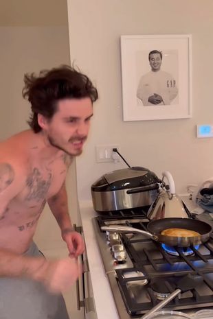 在为妻子尼古拉·佩尔茨做煎饼时,布鲁克林·贝克汉姆的脚被热油溅到,陷入了恐慌。
