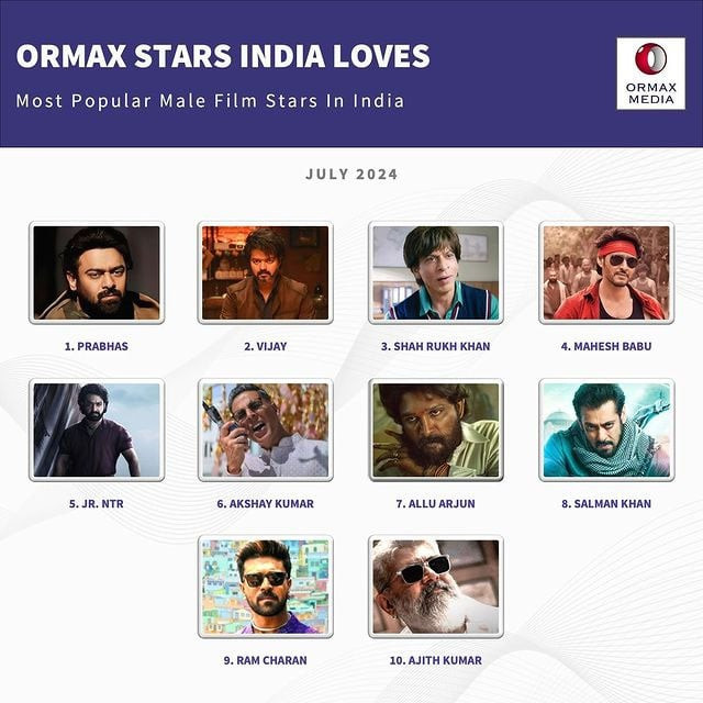 普拉巴斯在榜单上排名第一,他最近的超级热门电影《公元2898年的卡尔基》被认为是他受欢迎的原因。在这部电影中,他与宝莱坞女演员Deepika Padukone和传奇演员Amitabh Bachchan一起出演。