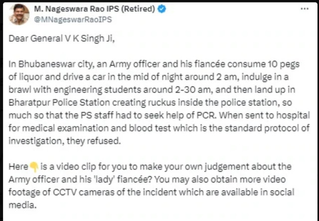 前中央调查局局长M Nageswara Rao和奥里萨邦退休警察福利协会质疑是否对涉嫌与工程学生打架并在巴拉特普尔警察局造成混乱的陆军军官采取了任何行动。