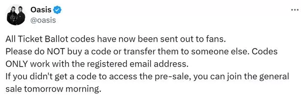 幸运的粉丝们在社交媒体上分享了他们的确认邮件,其中一条评论说:“绿洲的预售代码在银行里,加油,现在已经到了一半了。”