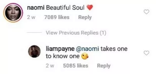 在2019年全英音乐奖上,主持人杰克·怀特霍尔在介绍利亚姆上台时,就这段不太可能的恋情开了个玩笑。杰克称这名男子组合成员是“娜奥米·坎贝尔现在的情人”,并开玩笑说,如果他背叛了她,他会陷入“痛苦的世界”。
