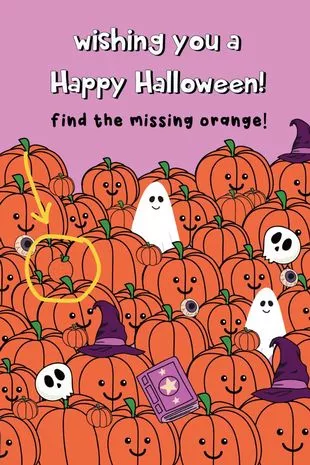这个特别的谜题来自Thortful卡片公司,要求你在充满南瓜和其他幽灵物品的恐怖场景中找到一个橙子。