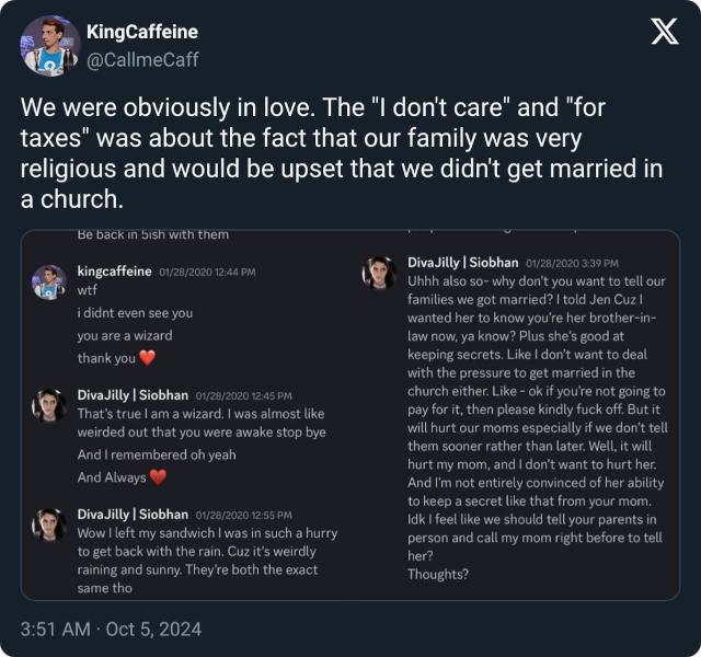 KingCaffeine迅速做出回应,分享了自己的截图,声称他的评论被误解了。他解释说,他们当时是相爱的,“税收目的”的评论只是为了解决他们的宗教家庭对他们的婚姻不在教堂举行的担忧。