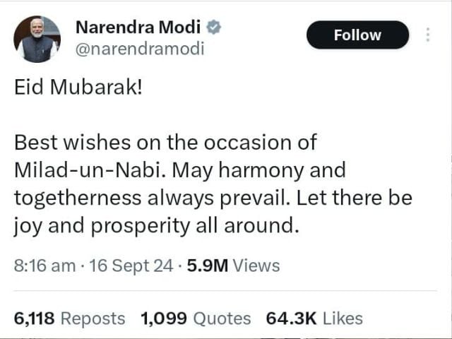 印度总理纳伦德拉·莫迪在纪念先知穆罕默德诞生的伊斯兰节日Milad-un-Nabi之际表达了他的良好祝愿。
