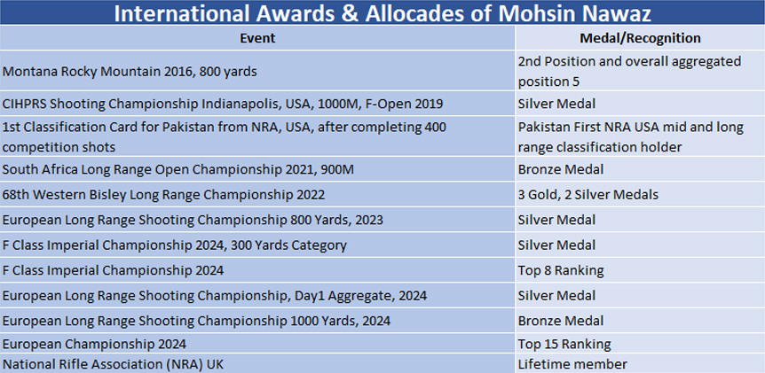 在欧洲杯上,巴基斯坦射手莫辛·纳瓦兹取得了令人瞩目的成就,他在第一天总赛中获得银牌,在1000码项目中获得铜牌,为他的国家感到骄傲。