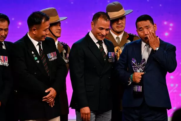 当哈里与救过他的五名廓尔喀老战友重聚时,他紧紧地拥抱在一起,流下了眼泪。