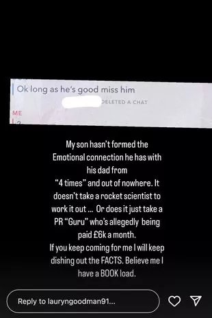 劳伦随后发推文说:“我可以以我孩子的生命发誓,我从来没有说过他是孩子的父亲”,然后声称一位公关代表透露了她孩子的父亲身份。然而,《镜报》了解到,在她的声明中提到的公关代表并没有做劳伦指责他们的事情。
