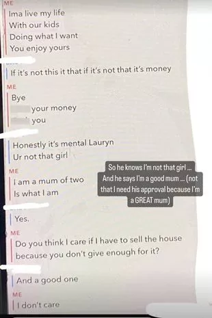 在这些没有注明日期和时间的信息中,劳伦和凯尔为房子、她的育儿技巧和其他问题争吵不休。今天早上,在她的Instagram故事中,劳伦似乎提醒了凯尔,她在一张截图上配文说:“如果你一直来找我,我会一直告诉你事实。相信我,我有一大堆书。”