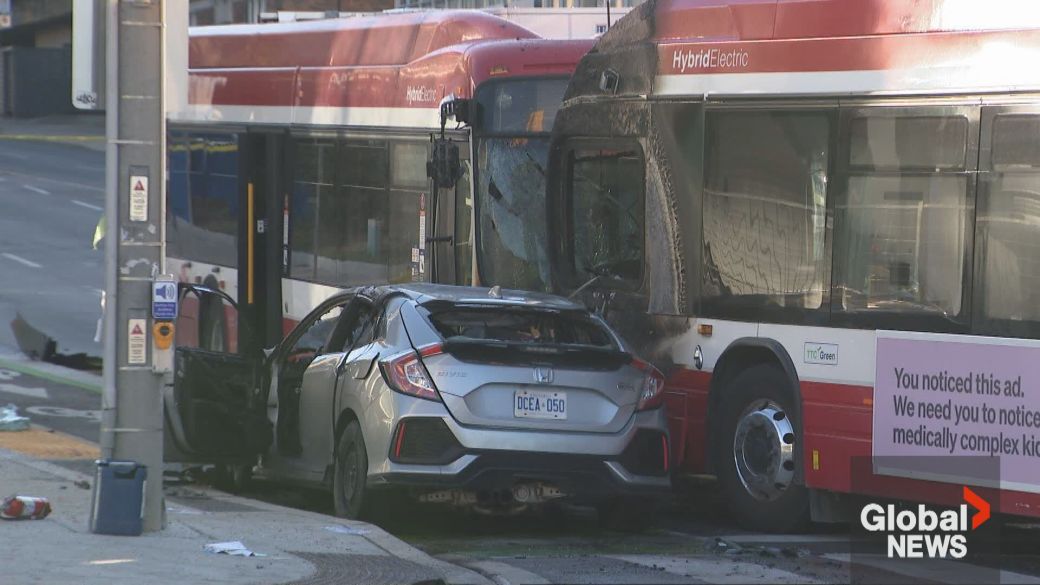 在那起案件中,警方表示,一辆据称被盗的本田汽车在巴瑟斯特街和埃格林顿大道西路口高速行驶时撞上了TTC的一辆公交车。