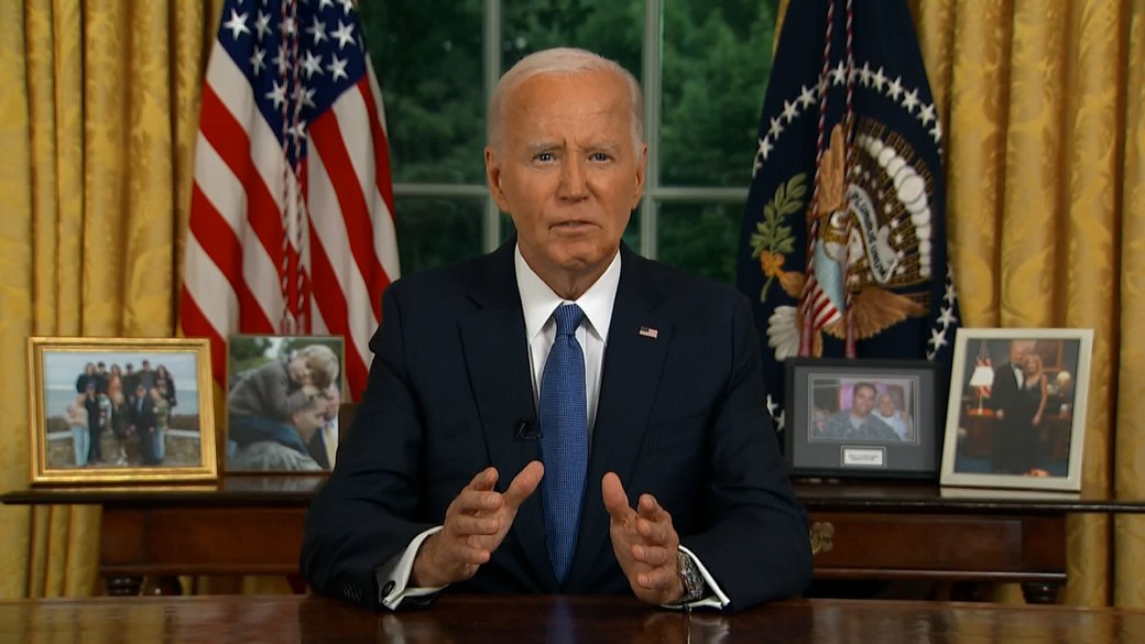 在他最初宣布退出竞选的三天后,拜登在椭圆形办公室的一次讲话中首次解释了他的决定,他的家人在房间里看着他。